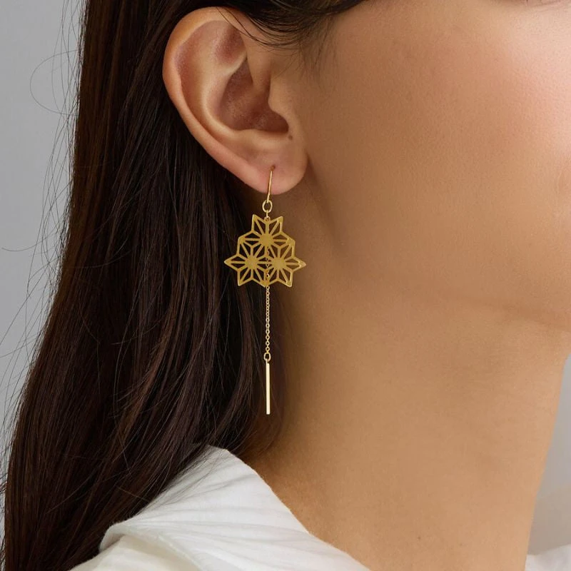 These gold-colored Asanoha earrings will enhance your femininity with their unique and eye-catching asymmetrical design. We are totally in love with this fine, delicate piece of jewelry. The geometric Asanoha motif, inspired by the hemp leaf, symbolizes strength and robustness. Often found on children’s kimonos, this traditional Japanese motif is also believed to offer protection against evil. Perfect for adding a touch of elegance and cultural significance to your look.