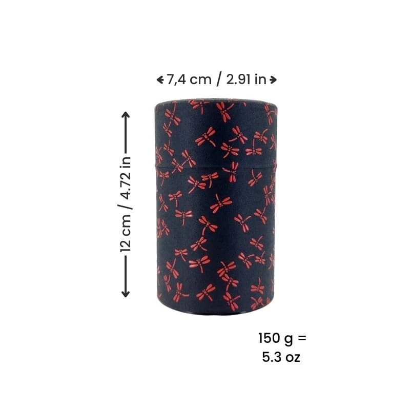 This bulk tea tin is made of tinplate and covered with a traditional Japanese paper called washi. On this paper, a red dragonfly pattern stands out on a black background. Once called “the island of the dragonfly” because of its shape, Japan has made this insect a symbol of strength, courage and victory. The dragonfly can only fly forward, giving the impression of never backing down from the enemy.