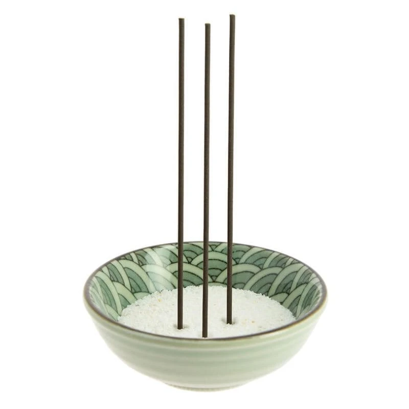 Add a touch of Zen to your home with this Japanese ceramic incense-holder, made in Japan and adorned with the traditional Seigaiha motif. Symbolizing the waves of the sea, this age-old design embodies peace and serenity. Supplied with a bag of marble sand, it allows you to plant one or more incense sticks for your moments of relaxation or purification rituals. A beautiful object, both decorative and functional.