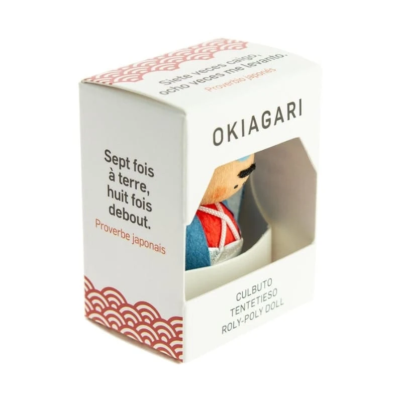 This handcrafted Japanese culbuto honors the Shinsengumi, a samurai brigade formed in the late 19th century to defend the shogunate. Wearing a blue kimono, a crossed white rope, and a headband marked with the character for “sincerity,” this little warrior reflects the values of Bushido: loyalty, honor, and courage.