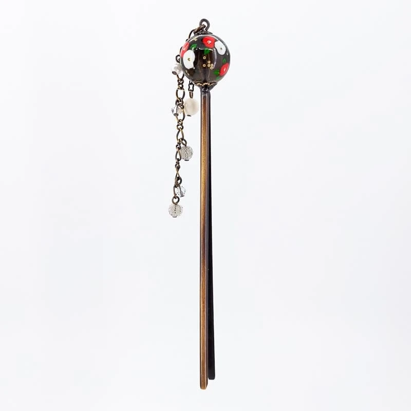 Bring a touch of tradition and refinement to your style with this Japanese kanzashi. It is composed of a double stem topped by a black ball decorated with camellia flowers. This hair accessory will sublimate your buns and other raised hairstyles.