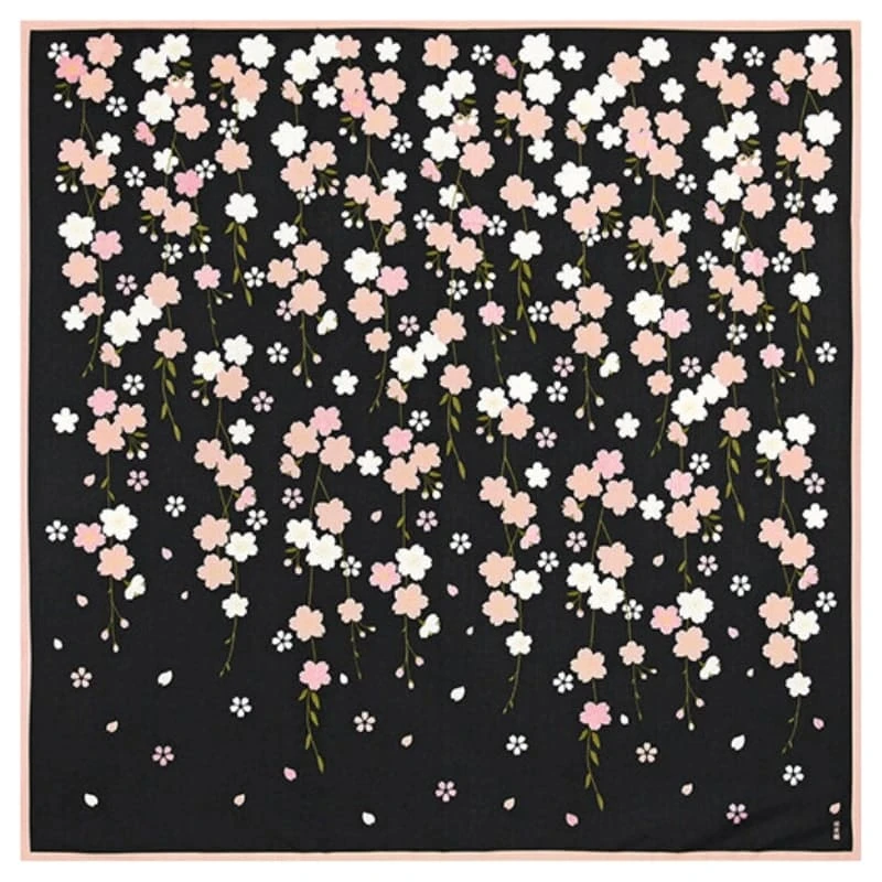 This Furoshiki Cloth – Sakura by Night – 35×35 in showcases a graceful rain of cherry blossoms against a deep black background, capturing the poetic charm of a Japanese spring night. Made in Japan from 100% shantung cotton, the lightly textured fabric offers both softness and durability.