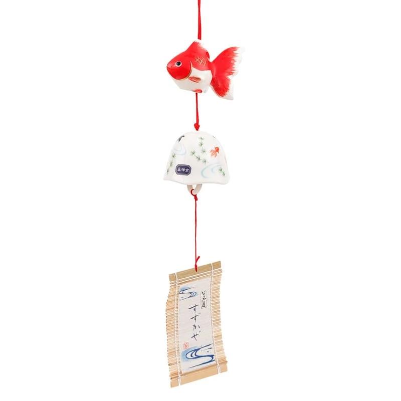 In Japan, goldfish symbolize prosperity, luck, and fertility, often featured in traditional festivals and celebrations. This goldfish wind chime will add a charming Japanese touch to your home. Hang it near an open window or under a sheltered area to enjoy its gentle tinkling. The characters すずかぜ on the paper mean “fresh wind.”