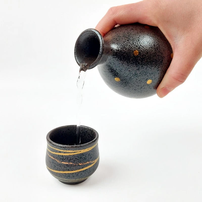 This porcelain sake set boasts a handcrafted yet modern design, adding elegance to your home decor. Beautiful as a decorative piece during the day, it seamlessly transitions into a sake service by night. We adore the rounded shape of the decanter and the exquisite gold details. The two sake glasses are ergonomically designed, enhancing your enjoyment of rice alcohol.