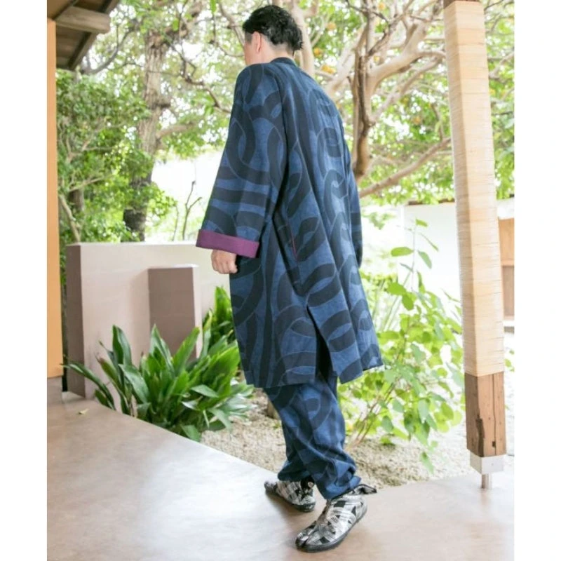 This long haori jacket men’s is decorated with the watsunagi pattern which symbolizes a lasting peace. The cotton fabric is thick and strong, perfect for everyday wear. Ties at the front allow this men’s haori kimono to be worn either open or closed. The sleeves can be rolled up. Perfect to complete a casual look all year round. A must-have in your men’s wardrobe!