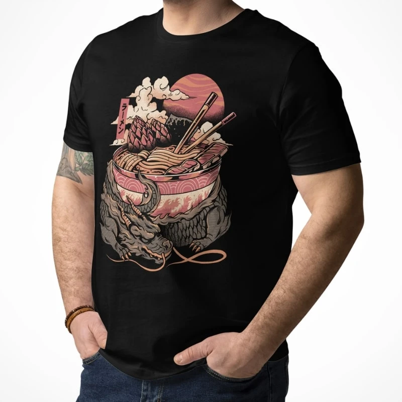 Style yourself with this Japanese “Dragon Ramen” T-shirt! This creative design features a Japanese dragon, the highly respected guardian of that mouth-watering bowl of ramen. Made from soft organic cotton, this t-shirt offers incomparable comfort while being kind to your skin. Thanks to its thick fabric and high-quality printing, you’ll enjoy vibrant colors that stand the test of time. Wear this t-shirt and let the power of the dragon and Japanese culture enrich your everyday style!