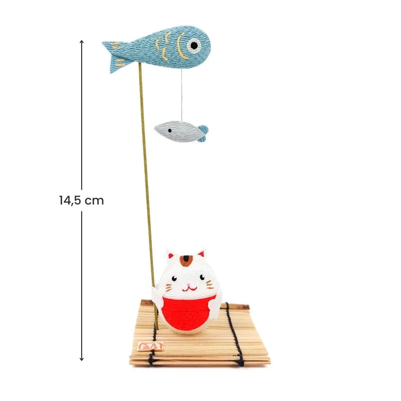 Showcasing the artistry of Japanese craftsmanship, this figurine features a small cat on a bamboo mat with two fish. It is made using the Japanese art of chirimen zaiku, which involves creating decorative objects from chirimen, a crepe-like fabric. This charming figurine is perfect for placing on a shelf, chest of drawers, or in a child’s bedroom.