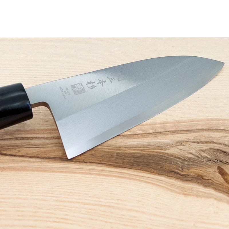 The Japanese Deba knife is an iconic tool of Japanese cuisine, recognizable by its distinctive and robust shape. With its thick blade and asymmetrical cutting edge, the Deba is specially designed for the precise cutting of fish and shellfish.