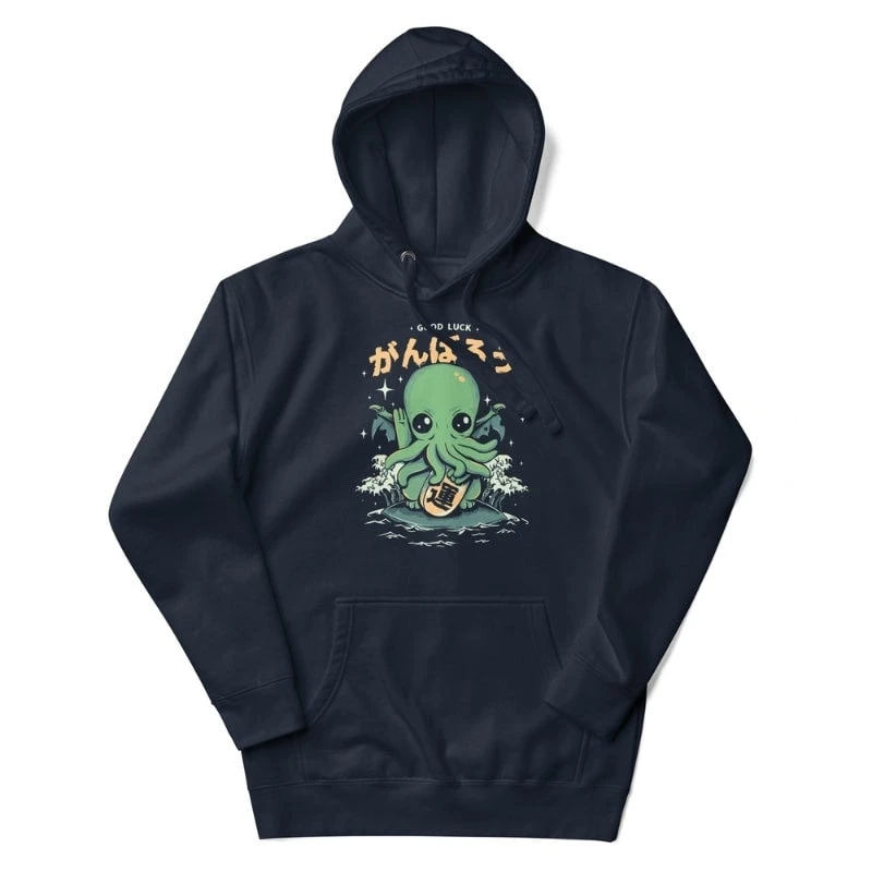 This hoodie features an adorable kawaii version of Cthulhu, holding a “Good Luck” sign in Japanese. With its playful design and positive energy, it transforms the mythical creature into a cute good-luck charm! Perfect for those who enjoy blending humor with Japanese pop culture. The wide hood and front pocket add a casual touch, while the soft, plush fabric keeps you warm and comfortable.
