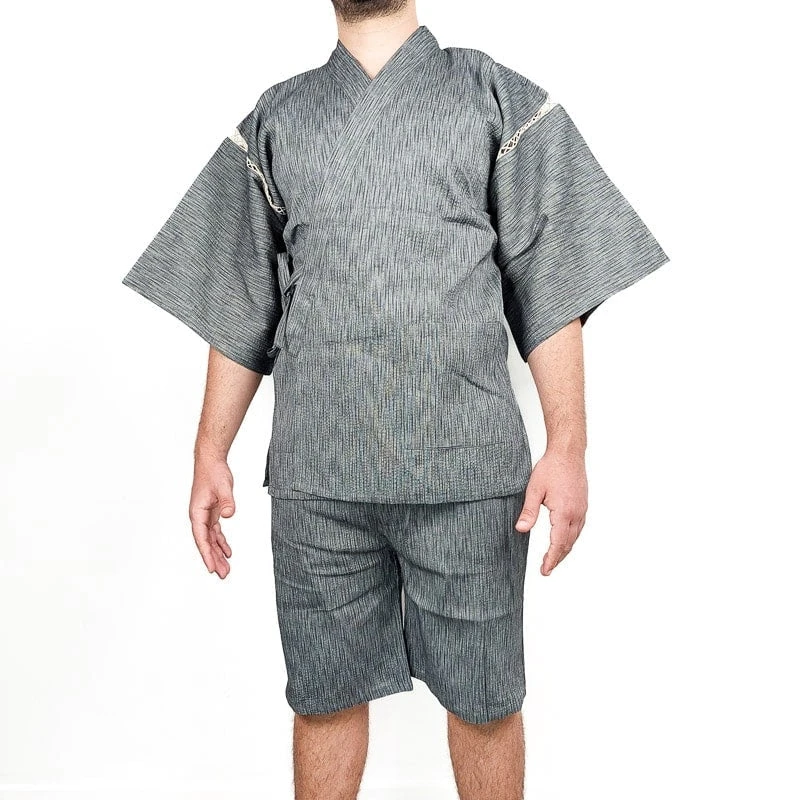 Put on this Japanese jinbei outfit and relax. With its loose fit, adjustable shorts and lightweight cotton fabric, this loungewear garment offers the perfect combination of comfort and elegance. In summer, you can wear it outside for a stroll in the park or to a matsuri (Japanese festival).