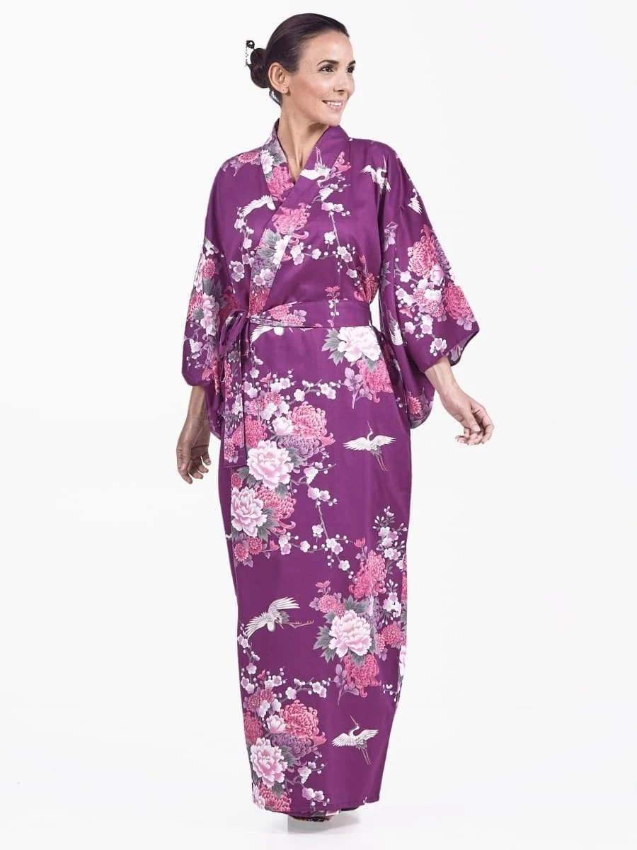 Women’s Purple Japanese Kimono with Peony and Crane Motif