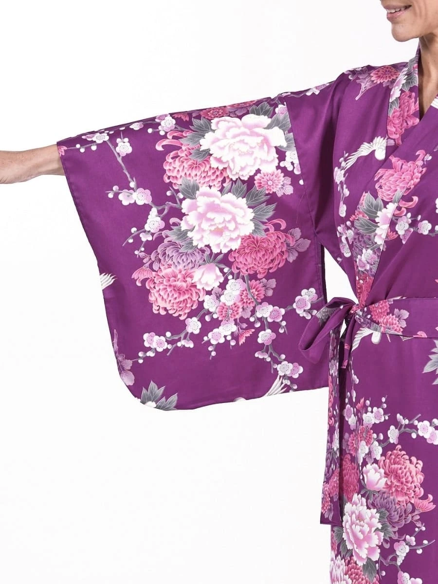 Find serenity in this exquisite Women’s Purple Peony & Crane Japanese Kimono, carefully crafted in Kyoto, Japan. Made from 100% cotton, the soft and breathable fabric wraps you in comfort while adding a refined touch to your relaxation time. Perfect for a calm moment at home, this kimono turns everyday lounging into a soothing ritual of well-being.