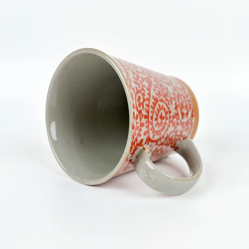 A pretty Japanese mug with handle for drinking coffee or tea. The ceramic is adorned with a red karakusa motif. Inspired by plant growth, this traditional motif symbolizes prosperity and eternity. This Japanese mug is also available in blue, making it the perfect gift for a couple.