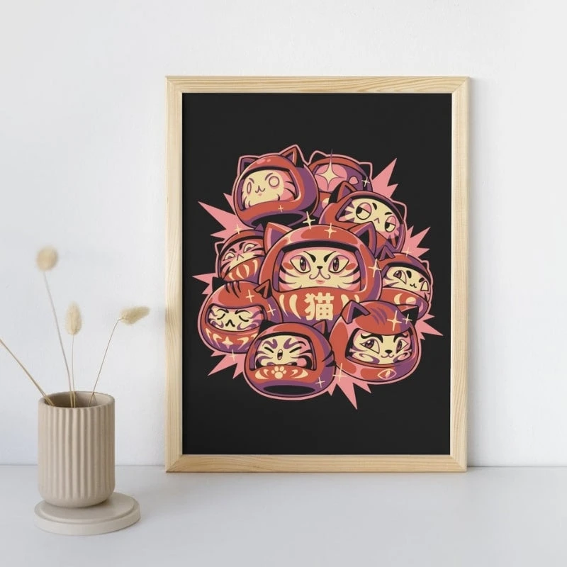 This vibrant Japanese poster features a playful reimagining of Daruma with an irresistibly kawaii cat face. It combines the Daruma’s symbol of perseverance with the lucky charm of the Japanese cat. Each figurine, with its unique expressions and sparkling eyes, radiates positive energy. A perfect addition to any space that seeks to bring good fortune and personality!
