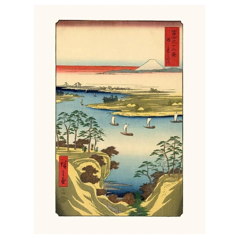 Reproduction of a print by Utagawa Hiroshige from the “Thirty-six views of Mount Fuji” series. This work is entitled Wild Goose Hill and the Tone River. Mount Fuji can be seen in the background.