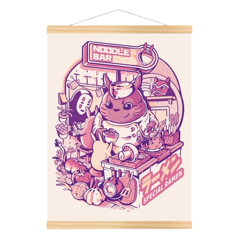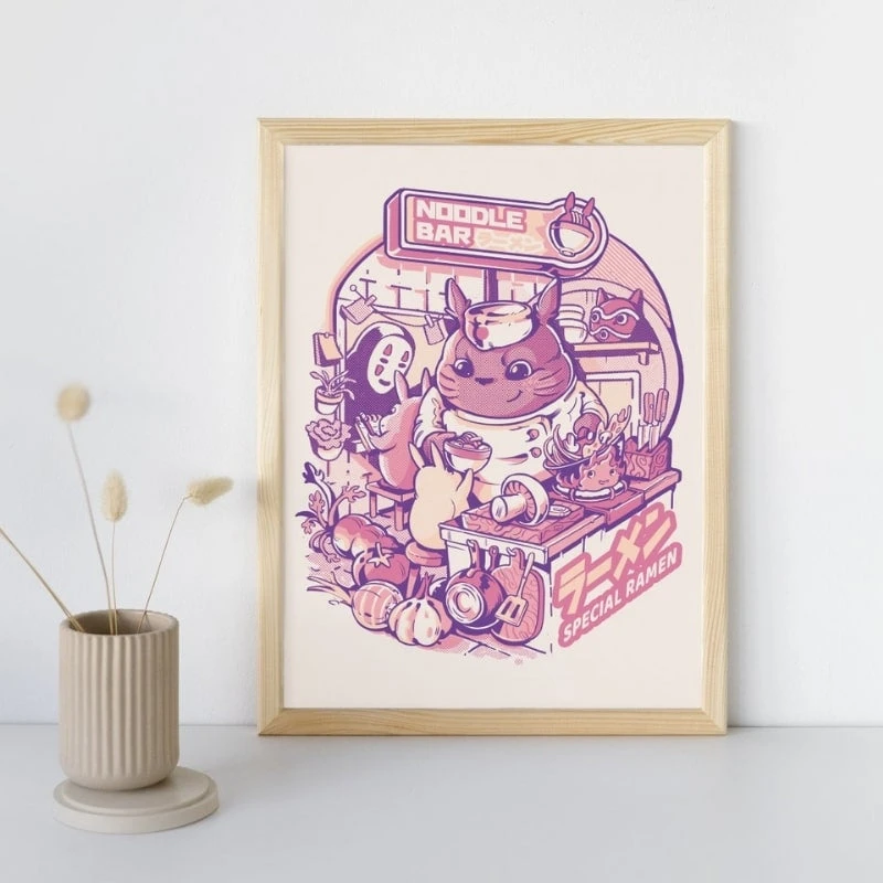 In this unique Japanese poster, Totoro takes on the role of a noodle bar chef. Featuring beloved Studio Ghibli characters, including the iconic no-face, who stops by to enjoy the chef’s special ramen. With soft pastel tones and a cozy atmosphere, this illustration is perfect for fans of Japanese culture and cuisine. It adds a whimsical, gourmet touch to any kitchen or snug corner.