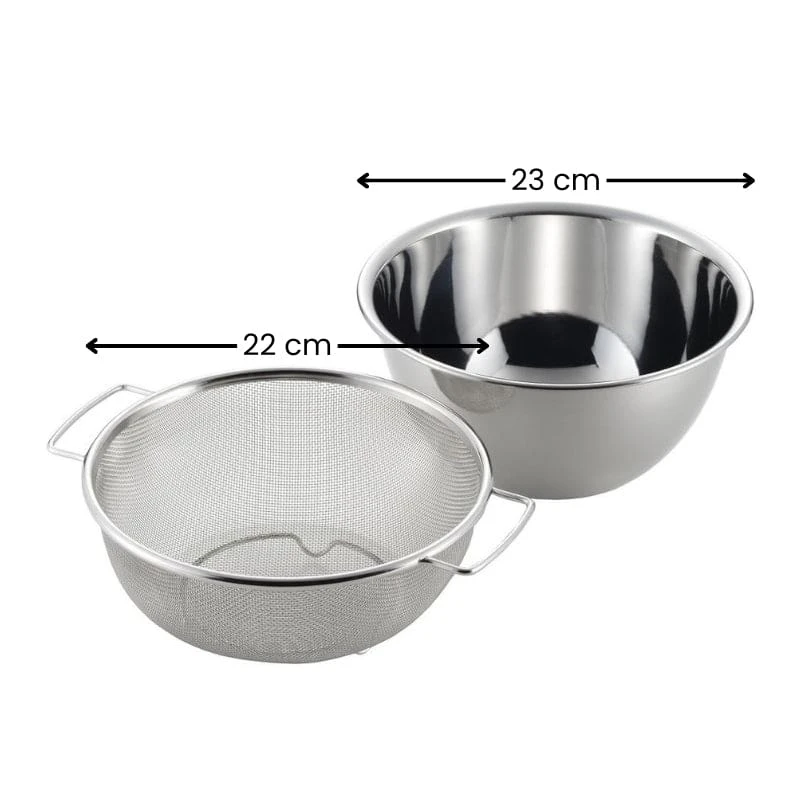 - Dimensions: Strainer: 22 × 9.5 cm / 8.7 × 3.7 in | Bowl: 23 × 11.3 cm / 9.1 × 4.4 in