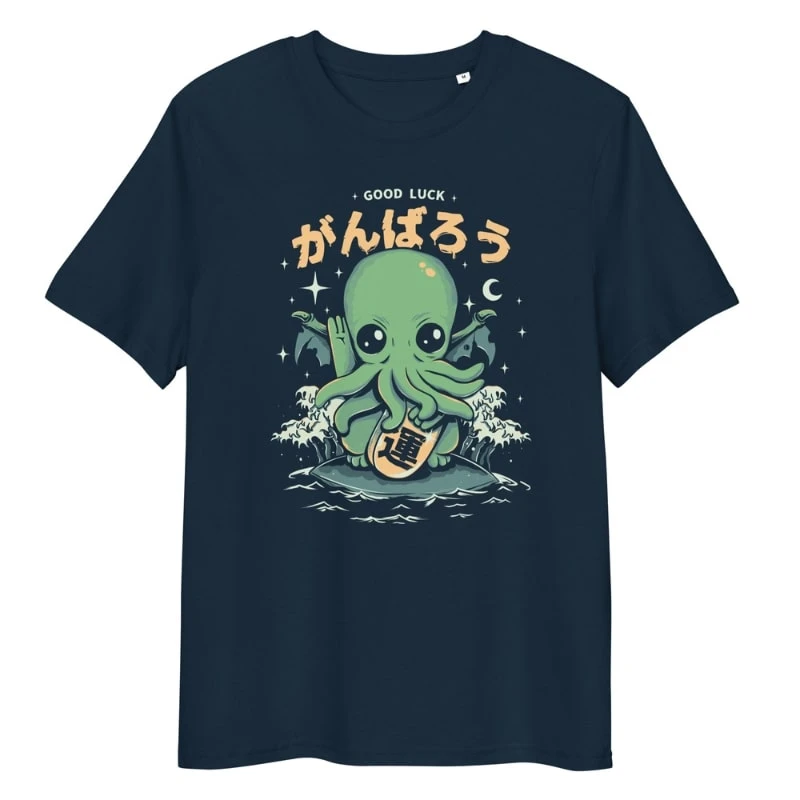 Bring yourself luck and good fortune with this Japanese “Good Luck” T-shirt! This cute and original design fuses the famous Cthulhu with the Maneki neko, Japanese lucky cat. The message “がんばろう” “Ganbarō” means “Good Luck” or “Do your best”. Made from soft organic cotton, this T-shirt offers superior, long-lasting comfort. High-quality printing ensures vibrant colors that stand the test of time. Show off your positivity in style and let this little Cthulhu bring you luck every day!