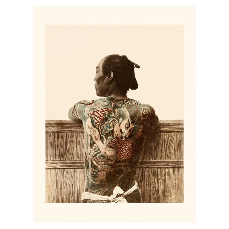 This colorized reproduction of a photograph by Kusakabe Kimbei, a renowned 19th-century Japanese photographer, offers a window into Japan’s fascinating past. Featuring a man with traditional tattoos that tell stories of courage, culture and art, this image is a vibrant tribute to the Irezumi tattoo tradition.