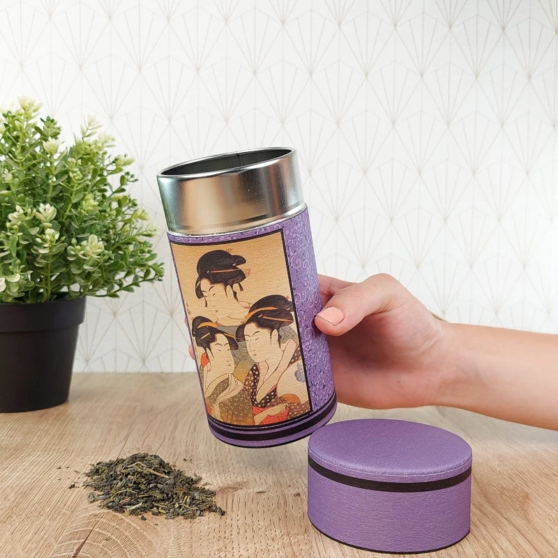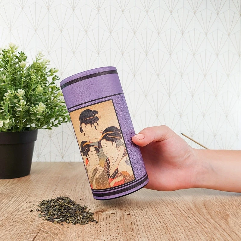Covered with washi paper, this tea tin will bring a nice Japanese touch to your kitchen. It features an ukiyo-e print, Three Beauties of The Present Day, by Japanese artist Utamaro. This work is part of the bijinga genre, which means “painting of feminine beauty”.