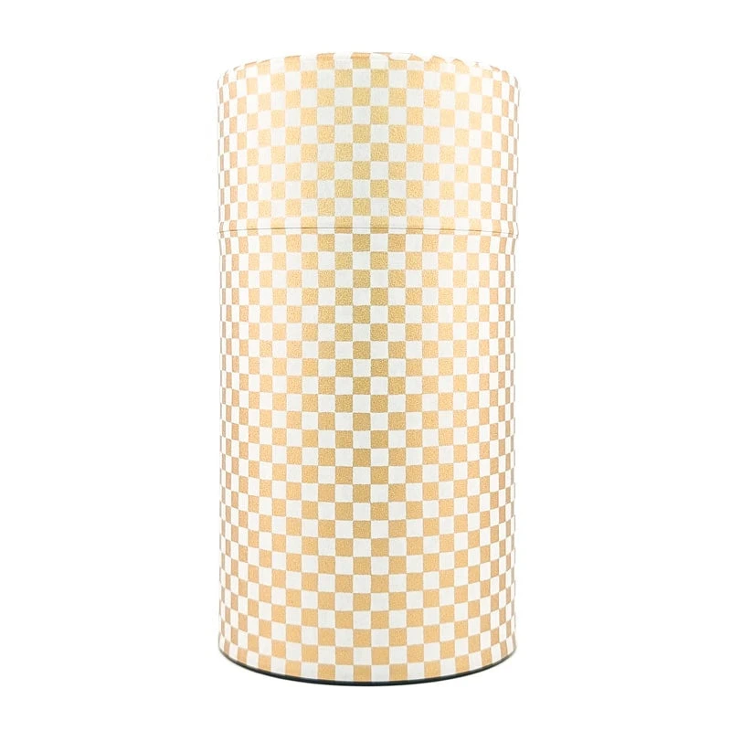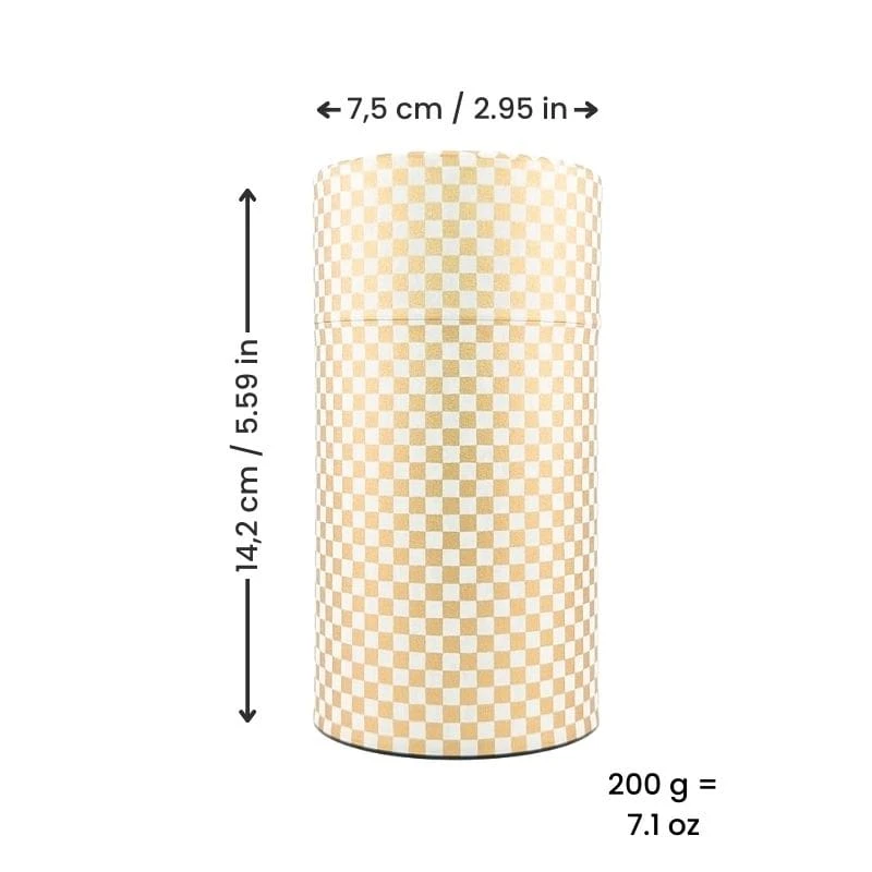 Elevate your tea ritual with this Japanese tea caddy, wrapped in high-quality washi paper. The checkerboard pattern, accented with gold highlights, exudes luxury and excellence. This large cylindrical tin can hold up to 200 g of tea while preserving all its rich aromas.
