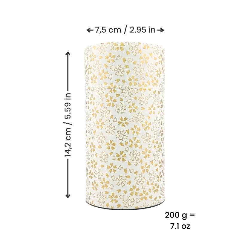 This Japanese tea caddy perfectly combines tradition and modernity. It is wrapped in washi paper adorned with sakura flowers, a classic Japanese motif. The golden color, symbolizing wealth and good fortune, offers stunning reflections in the light. Made in Japan, this double-lidded tin is designed to keep your tea as fresh as possible, ensuring that your last cup is just as fresh as your first.