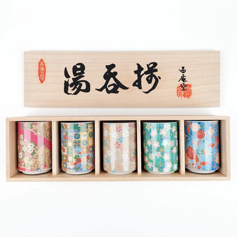 Find the elegance and refinement of kimono motifs on these pretty Japanese tea cups. Presented in their wooden box, these five porcelain cups are delicate, perfect for a tea party with friends. Displayed on a shelf, they will also decorate your home.