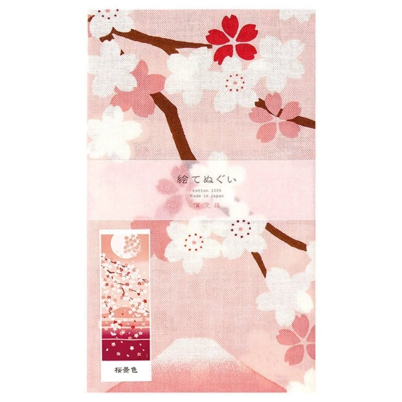 Handcrafted in Yokohama, Kanagawa prefecture, this tenugui is dyed using a traditional method called Nassen. Its cotton fabric is soft, light and highly absorbent. For centuries, the Japanese have used tenugui on a daily basis for drying, washing, transporting, wrapping and even decorating. This model makes a lovely decoration with its cherry blossom branch and Mount Fuji print.