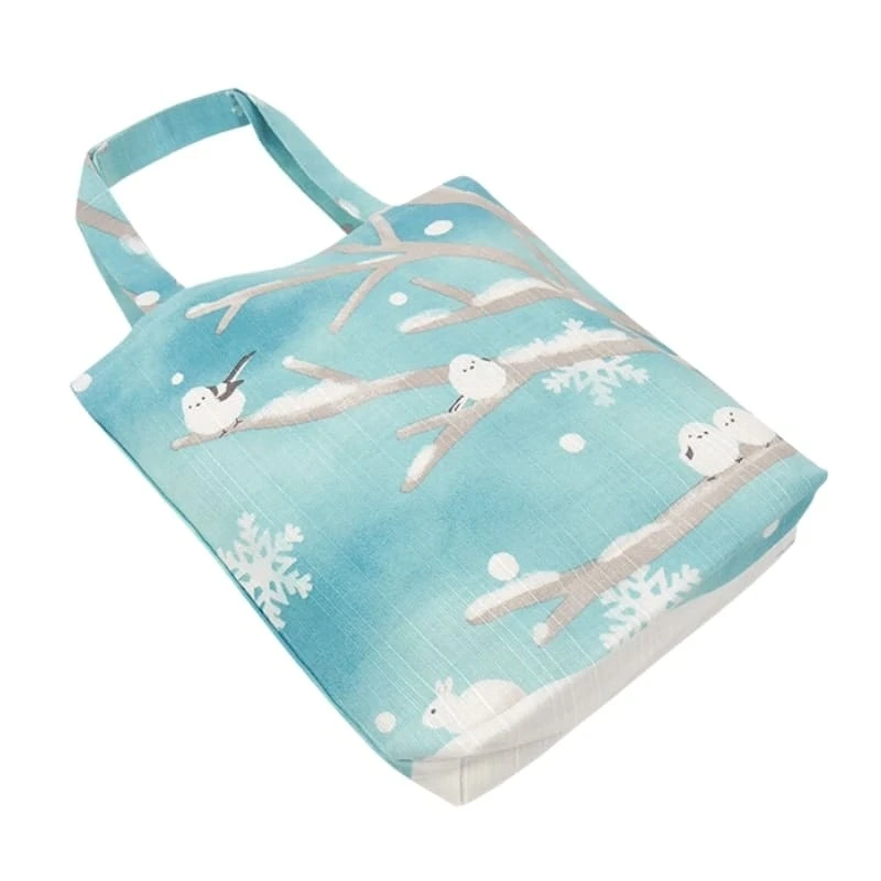 Immerse yourself in the quiet beauty of winter with this Japanese tote bag featuring shimaenaga birds perched on snowy branches. The serene design, with stylized snowflakes and a frosted blue background, evokes the stillness of a Japanese winter landscape. Made in Japan from shantung cotton, a soft and textured fabric with natural irregularities, it is both lightweight and durable.
