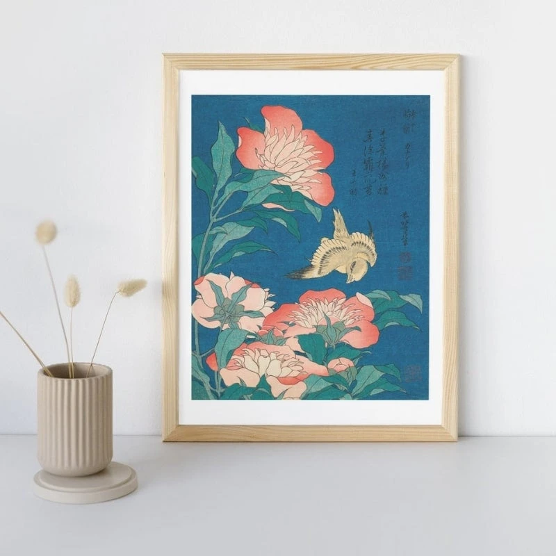 In this stunning Japanese woodblock print reproduction titled “Peonies and Canary” (1834), Katsushika Hokusai captures a moment of natural beauty with vibrant peonies and a canary in flight. The striking contrast between the red flowers and the deep blue background highlights the delicate floral details and the graceful movement of the bird. Hokusai, renowned for his depictions of nature, masterfully creates a scene that is both dynamic and harmonious.