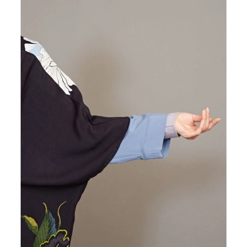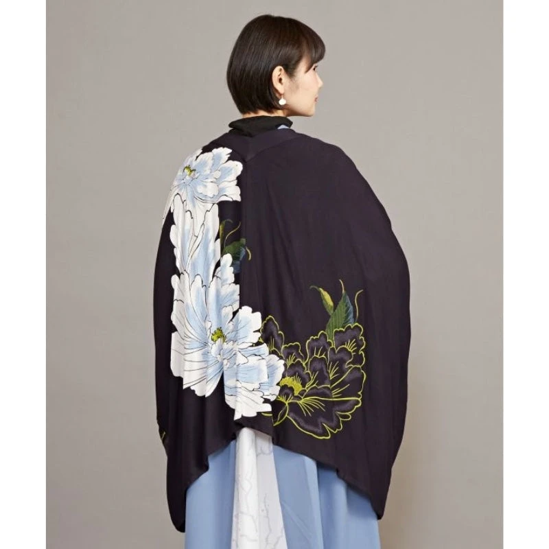 Looking for a unique and elegant piece for your wardrobe? This kimono style jacket for women is just what your wardrobe needs. The delicate print represents peony flowers, the queen of flowers in Japan. Symbol of the feminine ideal, the peony represents goodness and strength of mind. You will appreciate this kimono jacket for its loose fit that offers great freedom of movement and its flowing fabric, soft to the touch.