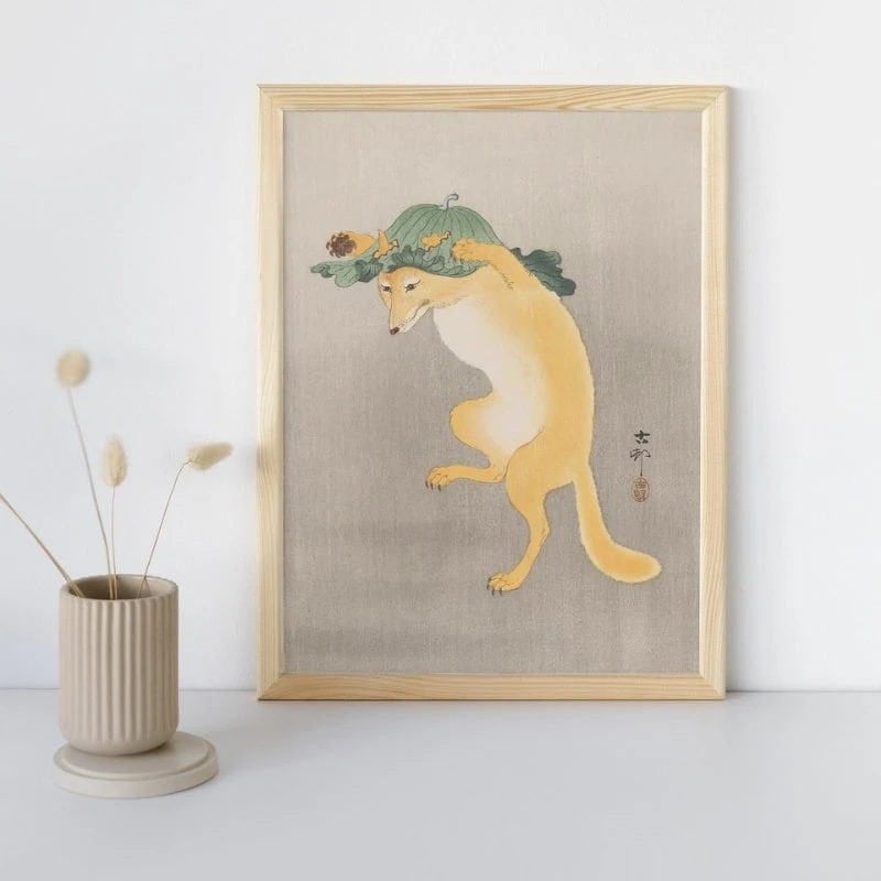 Messenger of the goddess Inari, mischievous creature with magical powers, the Kitsune is a mythical animal of Japanese folklore. This fox is said to have the power to take on a human appearance to play tricks on people. However, if he likes you, the Kitsune can become a faithful and protective animal. This Japanese artwork is a reproduction of a work by the Japanese artist Ohara Koson. It represents a fox dancing in the rain with a lotus leaf as a hat.