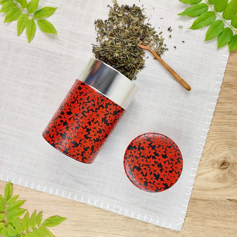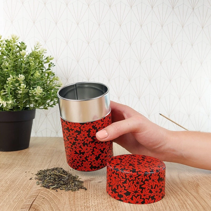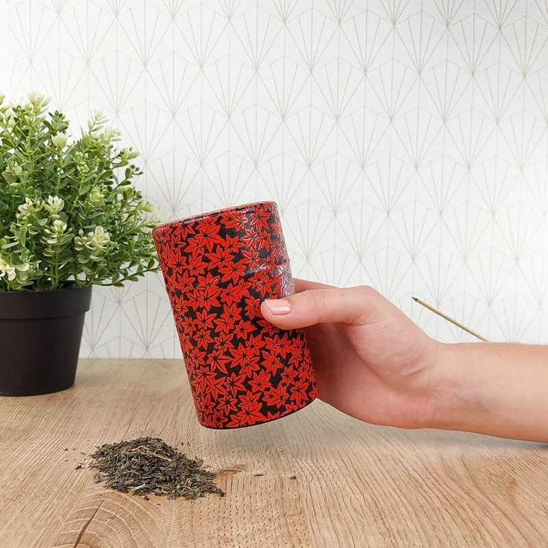 The washi paper that covers this tea caddy is decorated with red maple leaves on a black background. In Japan, the maple leaf is symbolic for love. Each fall, the Japanese go to admire the flamboyant colors of the maple trees during the momijigari, “the hunt of the red leaves”.