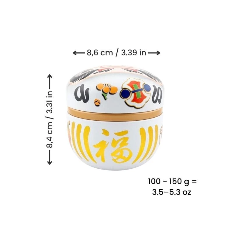 Japanese metal tea tin in white with Daruma design