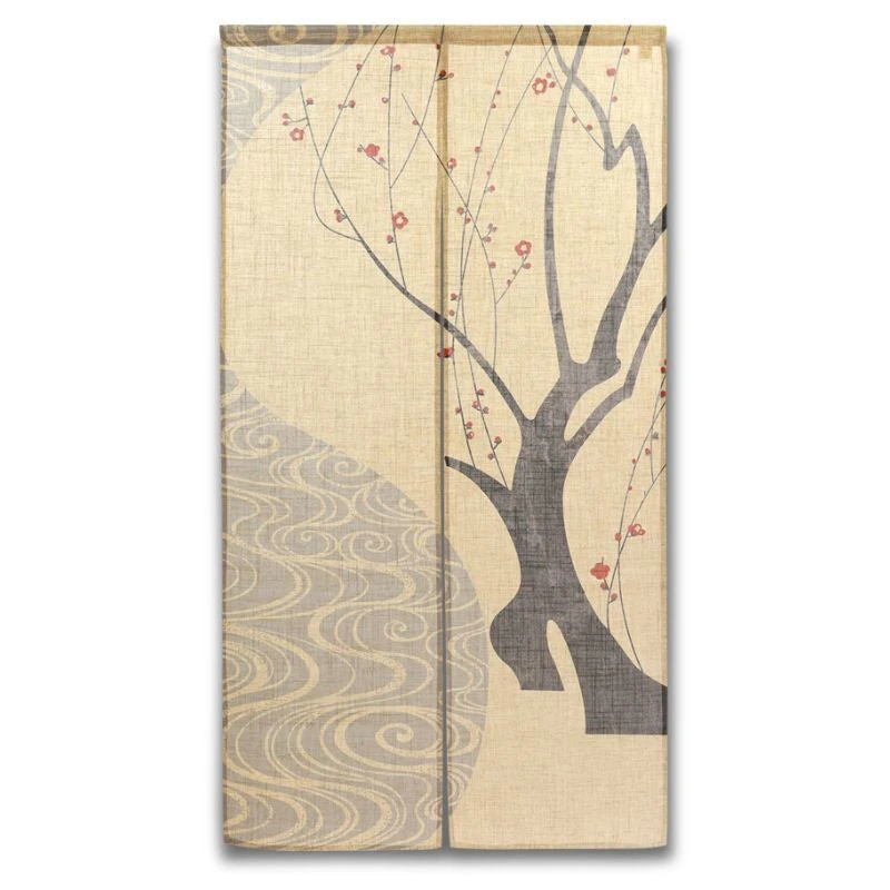 This noren features a naturally patterned design that blends the serenity of a river with the majesty of trees, creating a soothing, Zen atmosphere. Ideal for dividing spaces while adding a unique aesthetic touch inspired by Japanese culture. The hemp-like fabric allows light and air to filter through, enhancing the ambiance of your home.