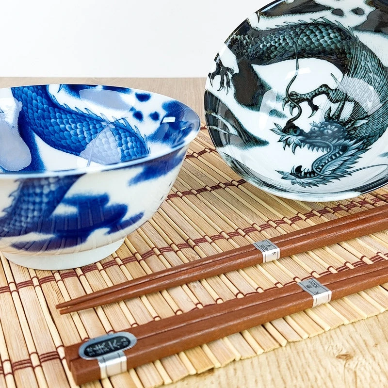 Awaken the strength of the dragon within you with these two beautiful Japanese bowls and their pair of Japanese chopsticks. Made in Japan, these large bowls are perfect to enjoy ramen or other Japanese dishes. In everyday life, you can also use them for your morning cereal or your evening soup. This set of Japanese dishes makes a very nice gift!