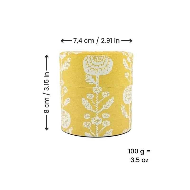 Store your tea in a stylish, traditional way with this small tin tea caddy, covered in yellow floral washi paper. The double lid ensures the caddy is airtight and opaque, preserving the full aroma of your tea. Add a touch of Japan to your kitchen with this elegant little tea caddy.