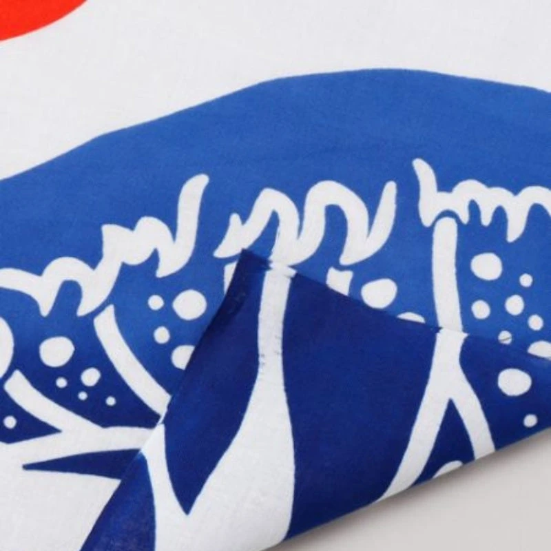 A beautiful indigo color, a bright red sun, an impressive wave that seems to swallow Mount Fuji… On this tenugui, we find one of the famous prints of Hokusai, the Great Wave off Kanagawa, revisited. This Japanese tenugui can be used either as a towel or as a wall decoration.