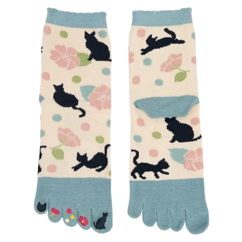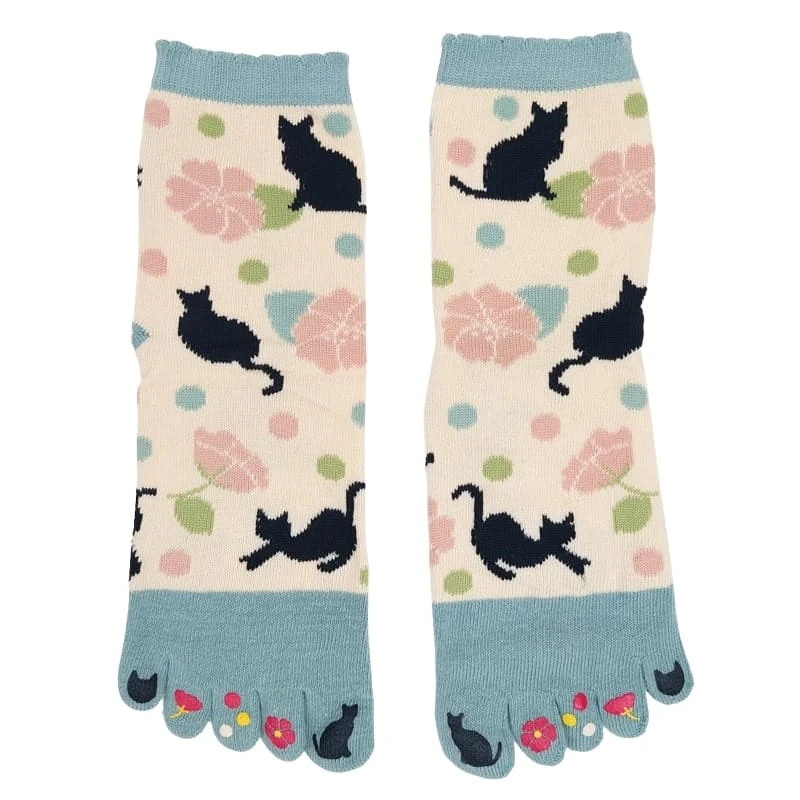These pastel-toned Toe Socks feature black cats, flowers, and a soft cream background. Beyond the kawaii design, they support foot health by promoting breathability and toe mobility. A purr-fect choice for cat lovers!