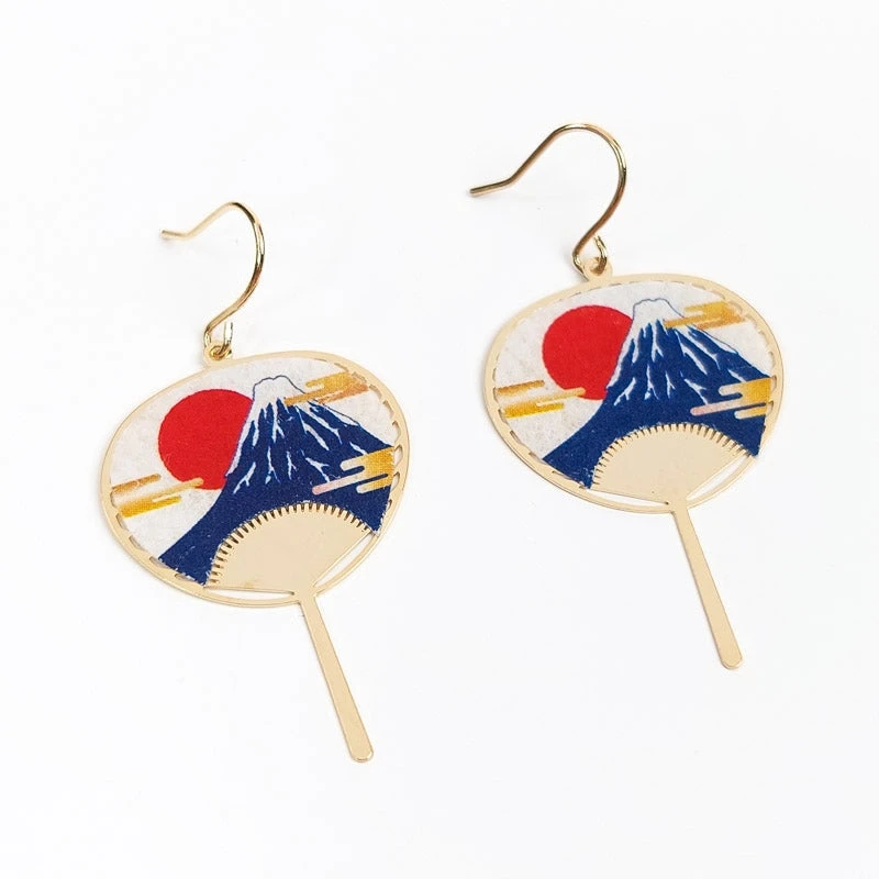 Japanese uchiwa fan earrings with Mount Fuji motif