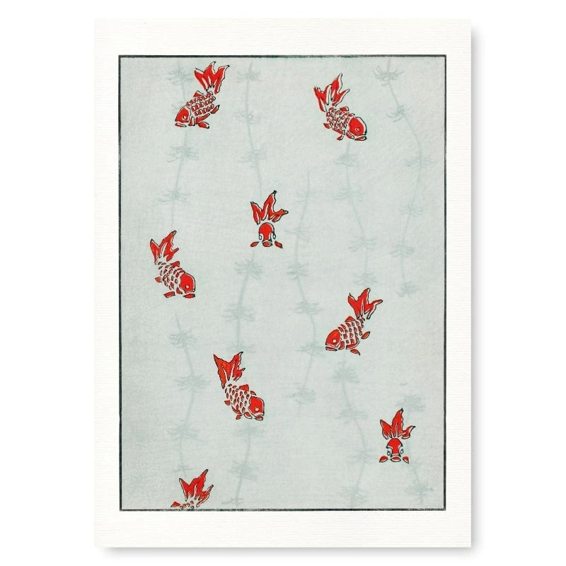 This delicate artwork by Watanabe Seitei, from the Shin Bijutsukai, depicts goldfish against a serene aquatic background. The vibrant details of the fish stand out against the soft backdrop, creating a peaceful and harmonious composition. Perfect for those who appreciate minimalist art with a Japanese influence, this print brings a sense of calm and fluidity to any space.
