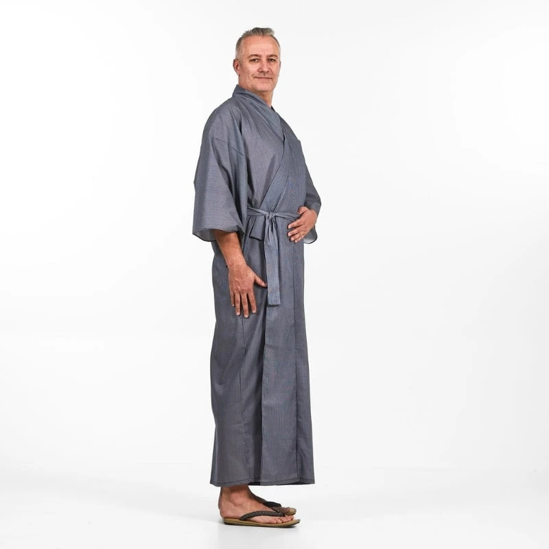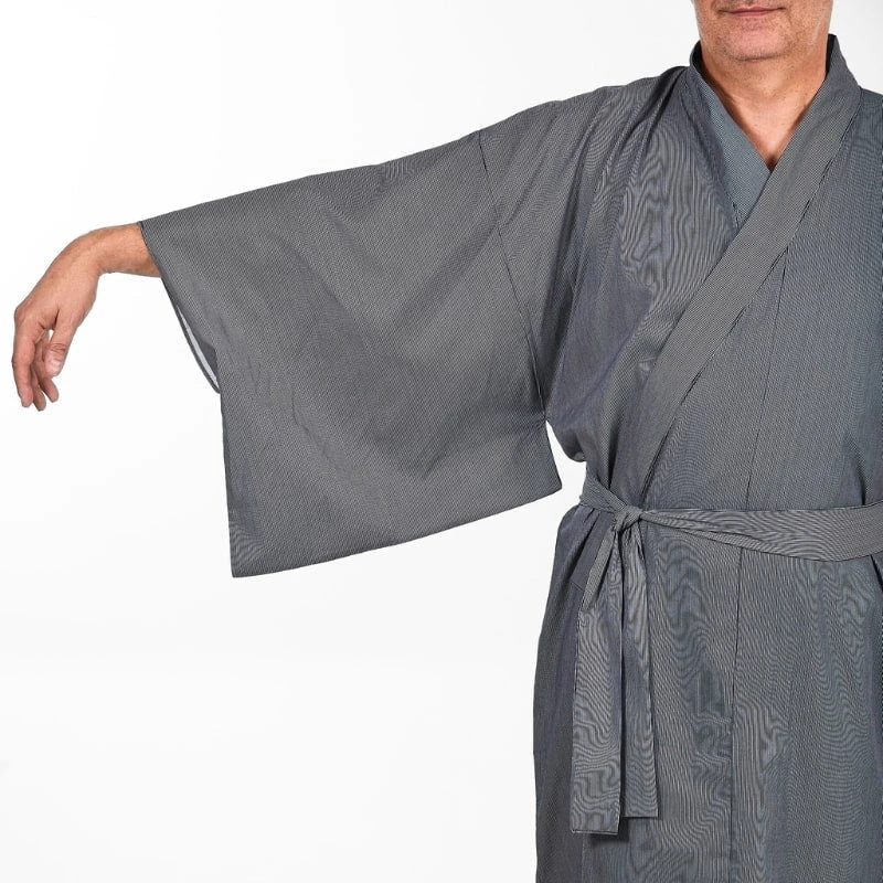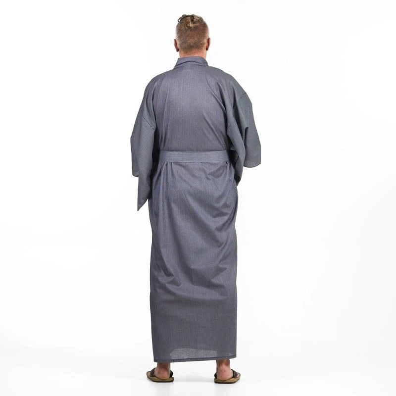This Japanese yukata is a lightweight summer kimono with a classic fine blue-gray stripe pattern. Made from 100% cotton in Kyoto, it is breathable and comfortable, perfect for warmer days. The loose fit and matching ribbon belt provide a relaxed yet elegant style, ideal for casual or refined occasions.